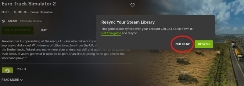 Here’s the fix: Open the game’s page inside GeForce Now and click the Steam button. Instead of trying to force another sync, select Mark as owned.