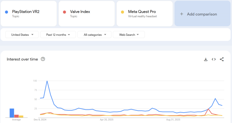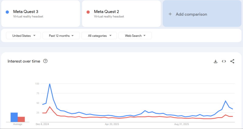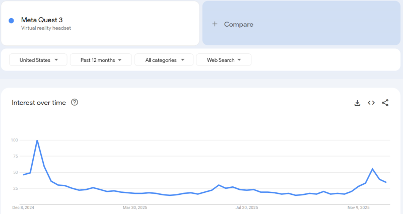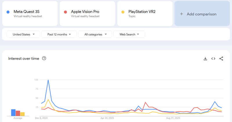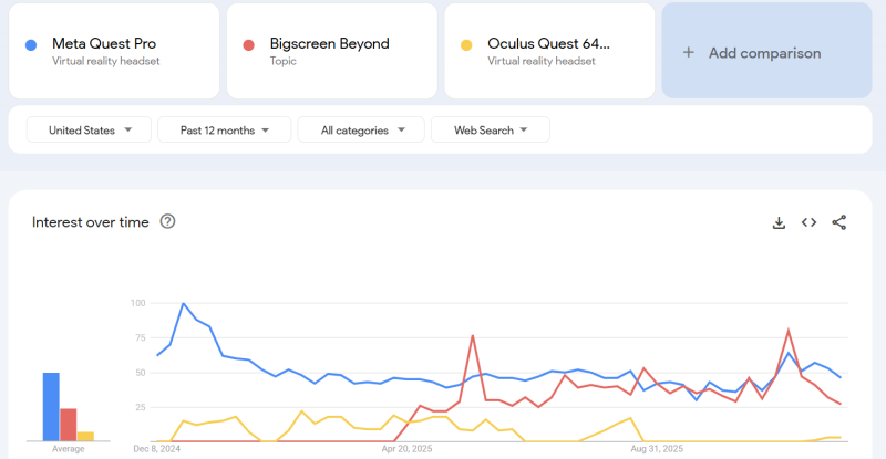 Overall, the Quest 3s shows similar interest patterns as the first 2 devices. Even though it’s newer and better than the Quest 2, it comes to our surprise that it sits lower in search interest even towards the end of 2025.